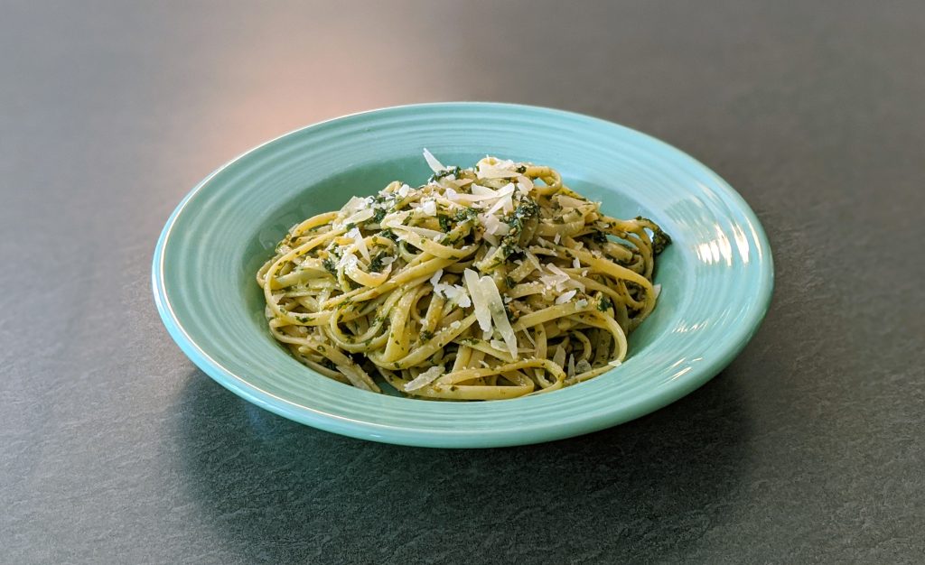 Pesto pasta is one of my favorite foods, and it’s definitely the tastiest thing I can easily, reliably make at home.
