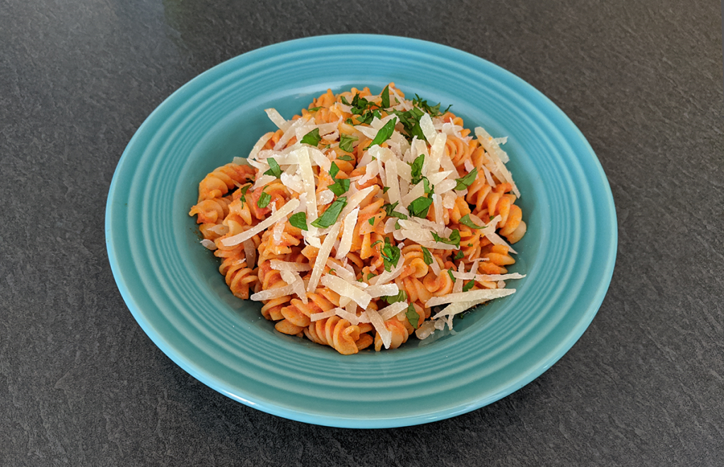The grocery stores in our area always have plenty of food, but since they rarely have everything on my list, my mid-February habit of “I’m going to make this meal and buy those ingredients” doesn’t work very well. Instead I think about the overall type of sauce that would suit the things I already have on hand or managed to grab during my weekly shopping trip. It’s a more improvisational process that’s easy enough to change up if I find myself with unexpected leftovers or produce that’s going off faster than expected. And since it’s different than how I usually plan meals, I keep thinking of it as quarantine pasta.