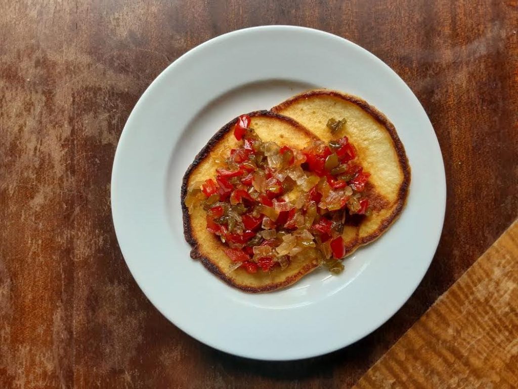 I chose to top my (Pancake? Cheese cake? Neither seems right.) with a pepper relish, which was good, but at the end of the day, I liked the cake better plain, no toppings. It looked like a pancake, but the flavor was richer and butterier than a pancake, and it held up well on its own. I did not try it this way, but after making it once, I’m thinking that Barbie’s butter and syrup suggestion was probably the right one. Or maybe salsa… I will definitely make these again to find out.